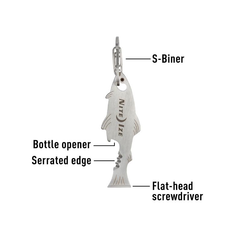 La herramienta DoohicKey FishKey tiene un divertido diseño en forma de pez que incluye un abrebotellas, un borde dentado y un destornillador. Con su S-Biner incorporado, siempre tendrás esta útil herramienta a mano.