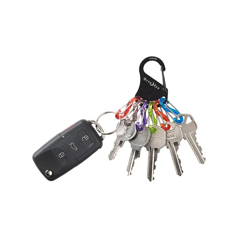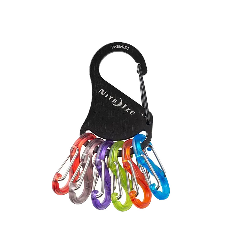 Este mosquetón de acero inoxidable se combina con seis coloridos S-Biners de plástico para colocar, retirar e identificar las llaves fácilmente. Enganche las llaves individualmente a los S-Biners y luego conecte el KeyRack a la trabilla del cinturón o a la correa del bolso usando el mosquetón.