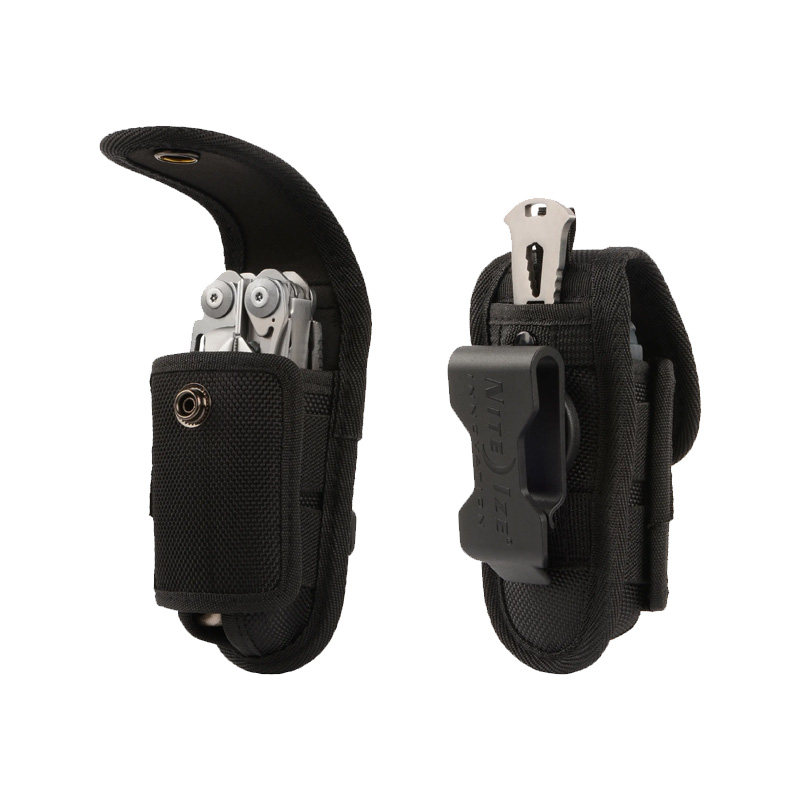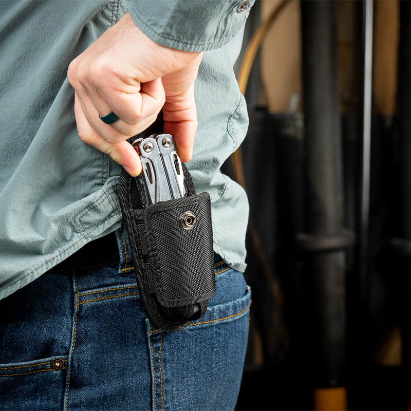 Esta funda universal para multiherramientas está fabricada en nailon balístico resistente con cierre a presión y paneles laterales elásticos que se expanden para adaptarse a multiherramientas y navajas de casi cualquier tamaño. El resistente clip giratorio se sujeta firmemente al cinturón o la cintura y se bloquea en 8 posiciones.